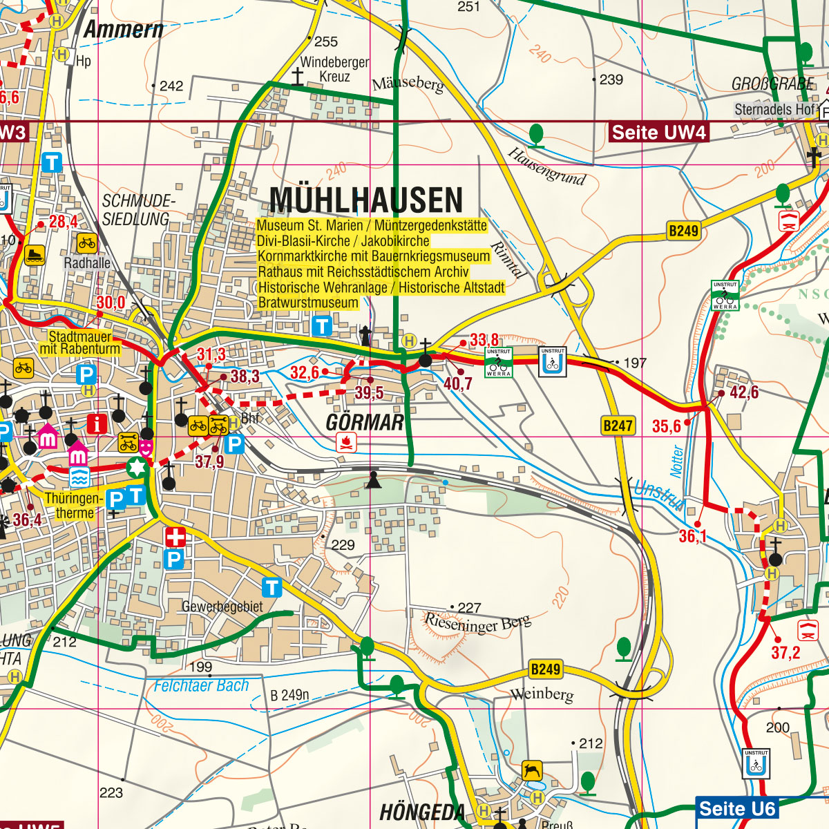 Im vorliegenden Radwanderleporello wurde auf eine Unterteilung in Etappen absichtlich verzichtet, da das Hotel- und Gastronomienetz entlang des Radweges zu unterschiedlich ausgeprägt ist und ein Angebot zum Radfahren ohne Gepäck noch nicht existiert. Jeder sollte nach seiner Leistungsfähigkeit die Aufteilung vornehmen. Einige Tipps zu Hotels und Gaststätten entlang des Unstrut Radweges finden Sie auf den jeweiligen Seiten.